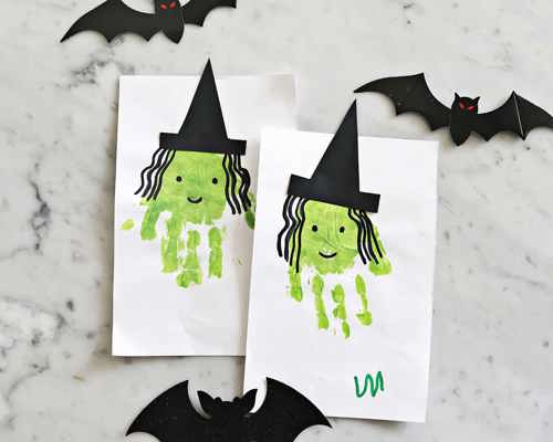 Instructions: Paint your child’s hand with washable paint and stamp it on paper. Turn handprints into ghosts, spiders, or monsters by adding eyes or details with markers.